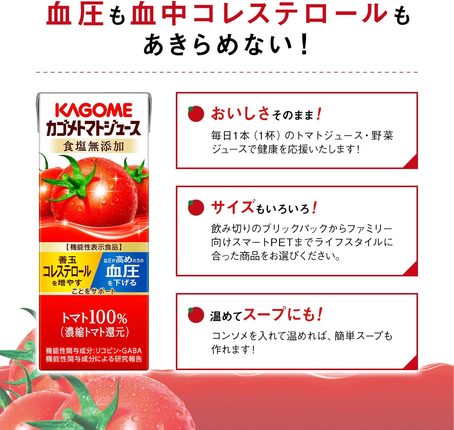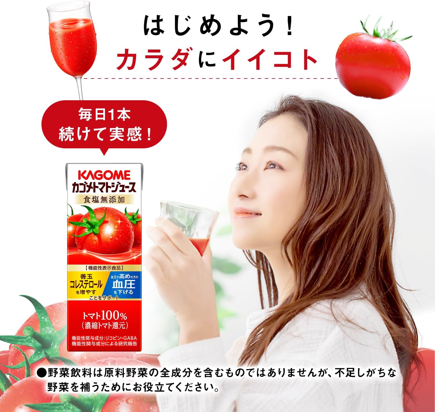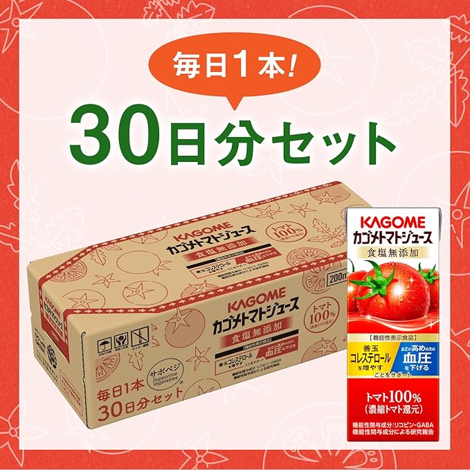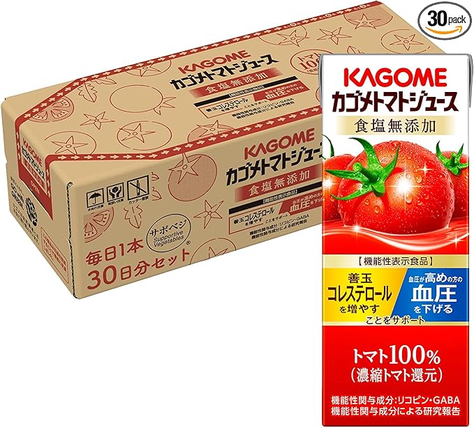 商品紹介 カゴメ カゴメトマトジュース 食塩無添加 200ml×30本 フル段ボールは、機能性表示食品です。本品にはリコピンとGABAが含まれます。リコピンには血中HDL(善玉)コレステロールを増やす機能が、GABAには高めの血圧を下げる機能があることが報告されています。血中コレステロールが気になる方や血圧が高めの方にお勧めです。1日1本(20 0ml)を目安にお召し上がりください。 原材料・成分 トマト(輸入又は国産)