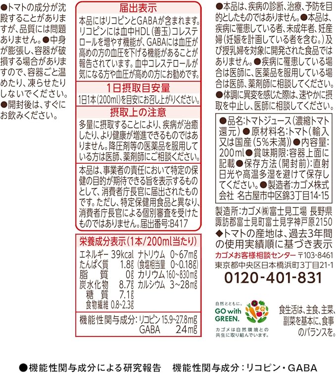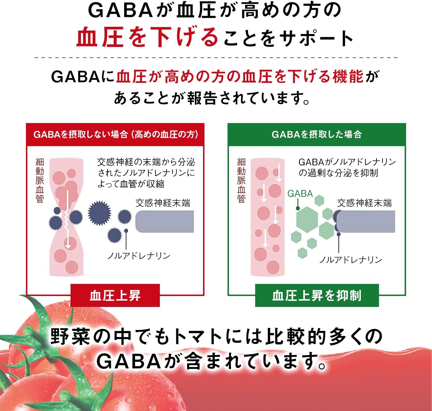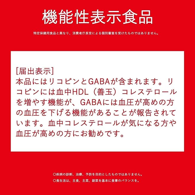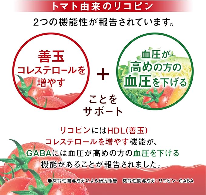 [届出表示]本品にはリコピンとGABAが含まれます。リコピンには血中HDL(善玉)コレステロールを増やす機能が、GABAには血圧が高めの方の血圧を下げる機能があることが報告されています。血中コレステロールが気になる方や血圧が高めの方におすすめです。(機能性関与成分による研究報告。機能性関与成分:リコピン、GABA)