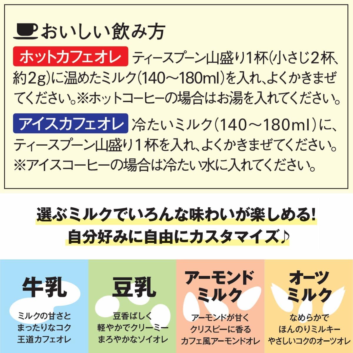 パウダーをつくる際にひと手間加えているから、温かいミルクはもちろん、 冷たいミルクにもサッと溶けます。 ミルク100%のまったり濃厚なカフェオレが 楽しめます。